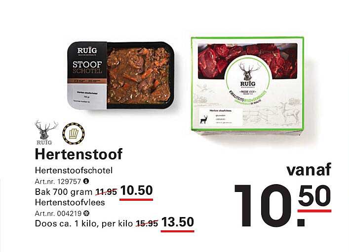 Normaal gesproken betaal je €11,95 voor deze hertenstoof van 700 gram, maar nu profiteer je van een scherpe prijs van slechts €10,50. Dat is een voordeel van meer dan 10%! Voor de 1 kilo verpakking geldt een prijs van €13,50, in plaats van €15,95. Dit is een kans om voordelig, kwalitatief en smakelijk vlees in huis te halen.