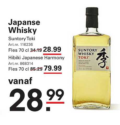 Ben je op zoek naar een bijzondere whisky om mee te genieten of als cadeau? Dan is de Japanese Whisky van Suntory Toki precies wat je zoekt. Met een aantrekkelijk aanbod van slechts €28,99 voor een fles van 70 cl, is dit hét moment om deze kwaliteitswhisky te ontdekken. Dankzij de unieke mix van smaken en de verfijnde Japanse bereidingswijze, biedt deze whisky een smaakervaring die je niet wilt missen.