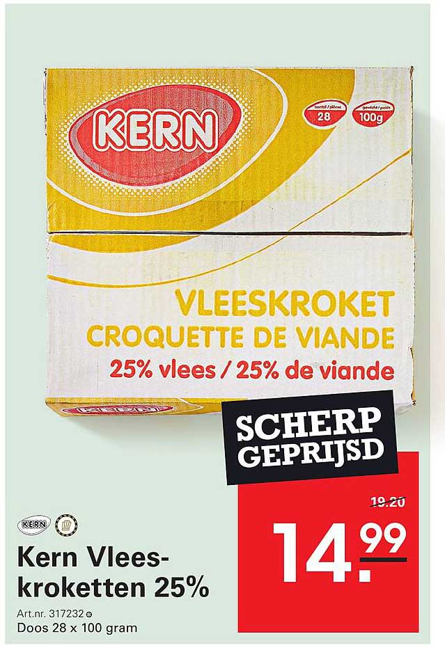 Bekijk nu de Kern Vleeskroketten 25% aanbieding in de Sligro folder. Deze aanbieding is geldig van 15-05-2025 tot en met 02-06-2025.