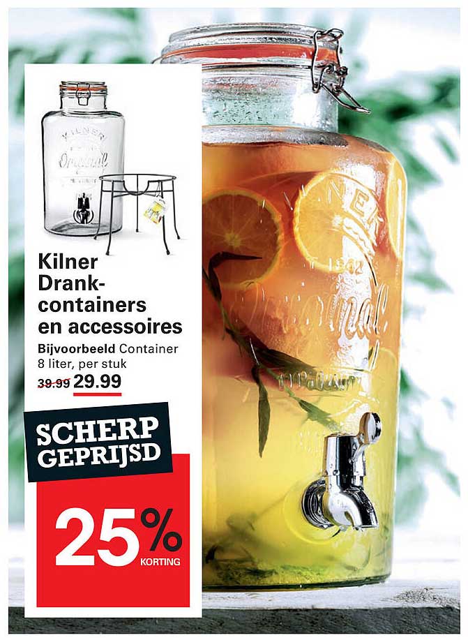 Ontdek de prachtige aanbieding van de Kilner drinkcontainers! Deze schitterende 8-liter container is perfect voor allerlei soorten dranken, van versgeperste limonade tot zelfgemaakte ice tea. Met deze container krijgt je iedere borrel of feest een extra speelse en stijlvolle uitstraling. De aanbieding is geldig van 5 oktober tot en met 27 oktober 2025, dus grijp je kans!