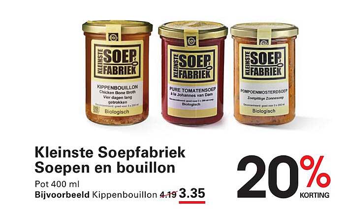 Ben je op zoek naar een heerlijke, biologische soep of bouillon om je maaltijd op te fleuren? Kijk dan snel hier! De aanbieding voor de producten van de Kleinste Soepfabriek is een geweldige kans om deze smaakvolle en voedzame potten soep of bouillon in huis te halen. Met een korting van 20% van de reguliere prijs is dit het moment om je voorraad aan te vullen!