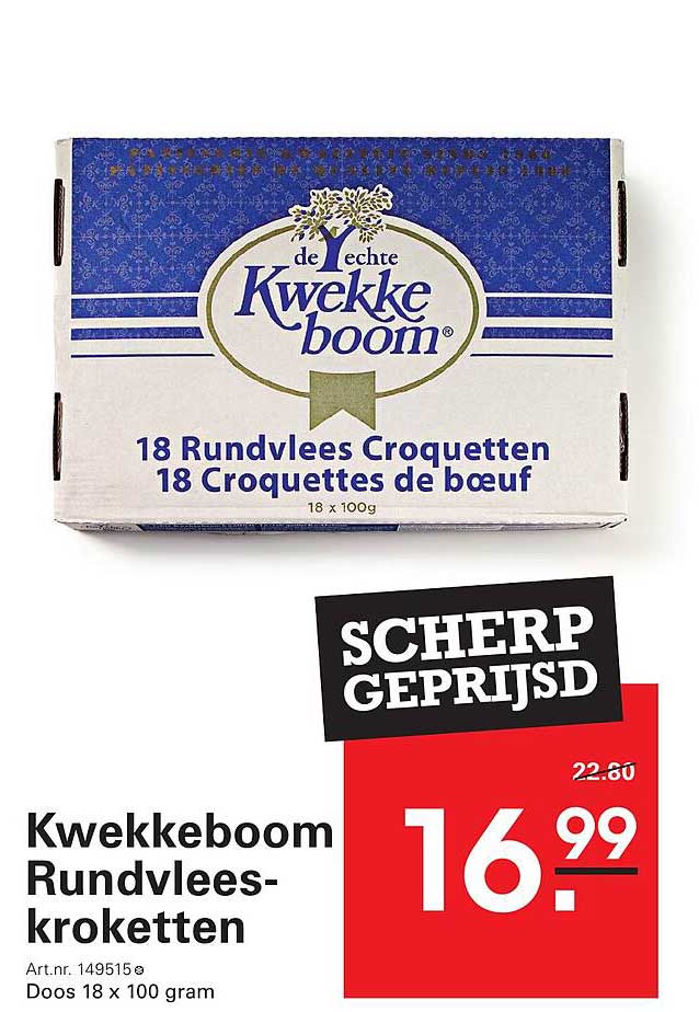 Normaal geprijsd op €22,80, haal je de Kwekkeboom Rundvlees-kroketten nu in huis voor slechts €16,99. Dit betekent dat je profiteert van een aanzienlijke korting, wat het een slimme aankoop maakt voor je volgende bijeenkomst of gewoon voor jezelf.
