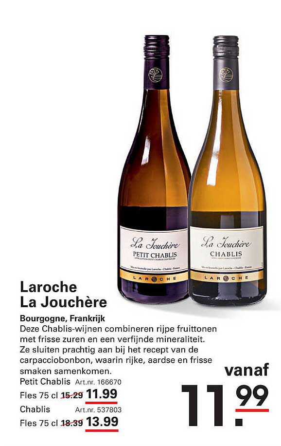 Profiteer van deze geweldige aanbieding met een prijs vanaf slechts €11,99 voor de Petit Chablis (normaal €15,29). Dit is niet alleen een uitstekende prijs-kwaliteitverhouding, maar ook een kans om een premium wijn te ervaren zonder je budget te overschrijden. Bezoek deze pagina voor meer details en andere geweldige aanbiedingen.