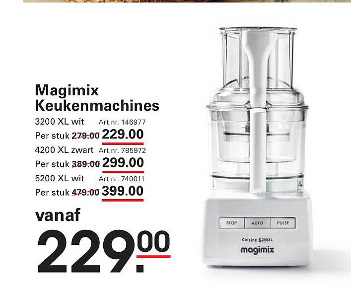 Met prijzen die beginnen vanaf €229,00 heb je nu de kans om te profiteren van een aanzienlijke korting ten opzichte van de normale prijzen. De 3200 XL was oorspronkelijk €279,00, maar is nu verkrijgbaar voor slechts €229,00! Dit betekent niet alleen besparingen, maar ook dat je een hoogwaardige keukenmachine in huis haalt voor een prijs die je niet mag missen.