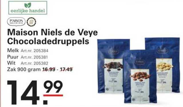 Ben je een liefhebber van chocolade? Dan is deze aanbieding echt iets voor jou! De Maison Niels de Veye Chocoladedruppels zijn de perfecte toevoeging aan je bakrecepten of om gewoon zo van te genieten. Met een prachtige korting van meer dan €2,- ten opzichte van de normale prijs, is dit het ideale moment om je voorraad aan te vullen!