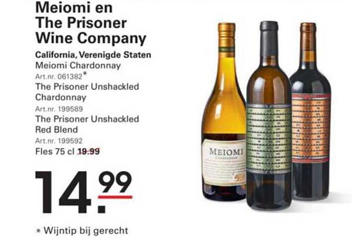 Geniet van de heerlijke wijnen van Meiomi en The Prisoner Wine Company voor een aantrekkelijke prijs! Van 2025-03-27 tot en met 2025-04-21 zijn deze topwijnen verkrijgbaar voor slechts €14,99 per fles. Het is een uitstekende kans om jouw wijncollectie uit te breiden met kwaliteitsvolle wijnen uit Californië.