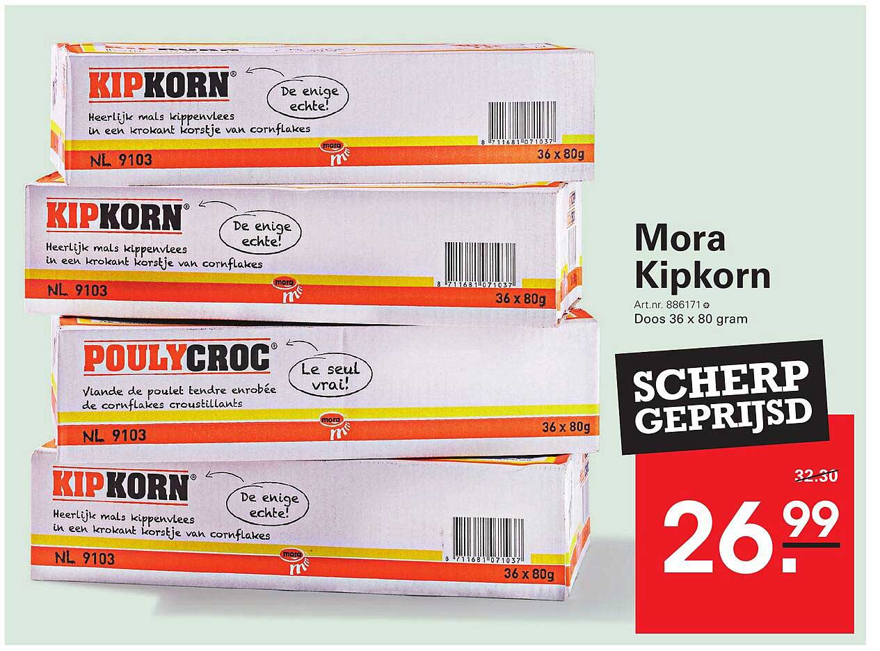 Bekijk nu de Mora Kipkorn 36 x 80 gram aanbieding in de Sligro folder. Deze aanbieding is geldig van 09-10-2025 tot en met 27-10-2025.