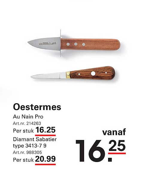 Met een prijs vanaf 16,25 is dit oestermes een geweldige aanbieding. Vergelijk dit met de reguliere prijs van 20,99 per stuk voor het Diamant Sabatier type, en je begrijpt meteen waarom je deze kans niet wilt missen. Je bespaart niet alleen geld, maar haalt ook een topkwaliteit mes in huis.