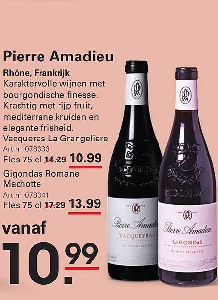 De Pierre Amadieu Vacqueyras La Grangelière en de Gigondas Romane Machotte zijn beiden van absolute topkwaliteit. De Vacqueyras is een fles van 75 cl, oorspronkelijk geprijsd op €14,29 maar nu te verkrijgen voor slechts €10,99. De Gigondas, ook 75 cl, heeft nog een normale prijs van €17,29, maar jij kan hem nu kopen voor €13,99. Beide wijnen komen uit de beroemde Rhône regio in Frankrijk en zijn zorgvuldig vervaardigd om de beste smaken en aroma's te garanderen.