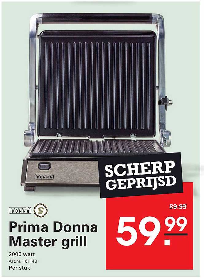 Ben je op zoek naar een betrouwbare grill die jouw kookervaring naar een hoger niveau tilt? Dan is de Prima Donna Master grill zeker iets voor jou! Met een krachtige installatie van 2000 watt en een scherp geprijsd aanbod, kun je binnenkort genieten van heerlijk gegrild voedsel in het comfort van je eigen keuken. Deze aanbieding is geldig van 15 mei 2025 tot en met 2 juni 2025, dus mis het niet!
