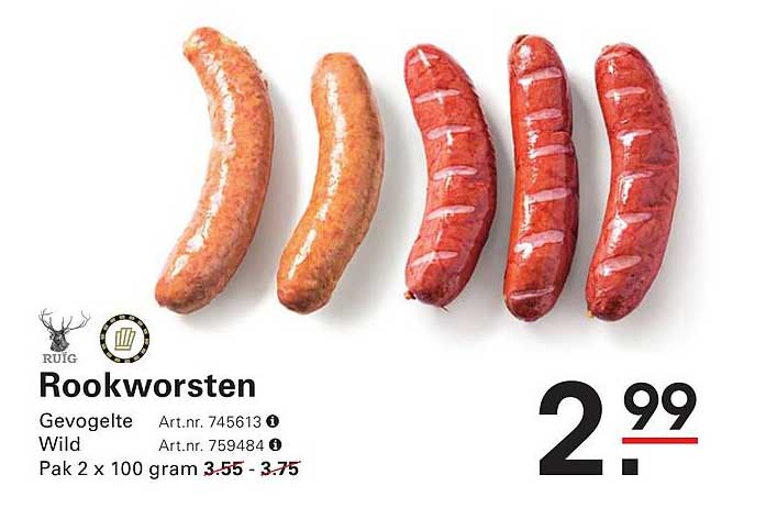 Ben je op zoek naar de perfecte toevoeging voor je maaltijd of een heerlijke snack voor tussendoor? Dan zijn de rookworsten in deze aanbieding van Sligro precies wat je nodig hebt! Deze heerlijke rookworsten zijn perfect voor zowel een gezellige barbecue als een winterse stamppot. Met een aantrekkelijke prijs van slechts €2,99 zijn ze een echte aanrader!