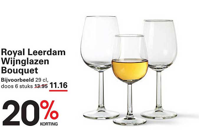 Bij FolderFeest.nl vind je een geweldige aanbieding voor de Royal Leerdam Wijnglazen Bouquet. Deze elegante glazen maken elke gelegenheid bijzonder! Met een doordachte vormgeving en een perfecte balans zorgen ze ervoor dat zowel rode als witte wijnen optimaal tot hun recht komen. En waarom nu kopen? Je krijgt maar liefst 20% korting, wat deze set onweerstaanbaar maakt!