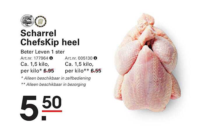 Heb je zin in een heerlijke maaltijd met vers geslacht kip? Op deze pagina vind je de aanbieding voor de Scharrel ChefsKip heel, perfect voor een gezellige zondagse maaltijd met vrienden of familie. De aanbieding is geldig van 9 oktober tot en met 27 oktober 2025, dus mis het niet!