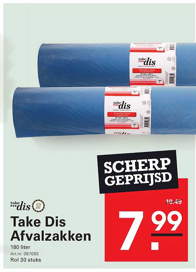 De Take Dis Afvalzakken zijn tijdelijk beschikbaar voor slechts €7,99 in plaats van de gebruikelijke €10,49. Dit betekent een besparing van €2,50! Een geweldige kans om slim te besparen terwijl je kwaliteit in huis haalt.
