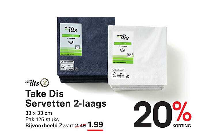Heb je binnenkort een feestje of een etentje gepland? Dan zijn de Take Dis Servetten 2-laags de ideale keuze! Met een afmeting van 33 x 33 cm zijn deze servetten perfect voor elke tafelsetting. Of je nu kiest voor de zwarte of de witte variant, deze servetten voegen een stijlvolle touch toe aan je gelegenheid. Bovendien krijg je nu 20% korting op de reguliere prijs, wat deze aanbieding nog aantrekkelijker maakt.