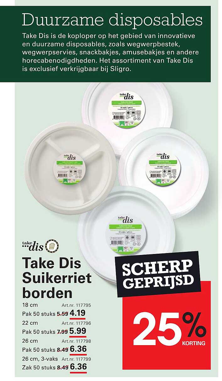 Bekijk nu de Take Dis Suikerriet borden aanbieding in de Sligro folder. Deze aanbieding is geldig van 09-10-2025 tot en met 27-10-2025.