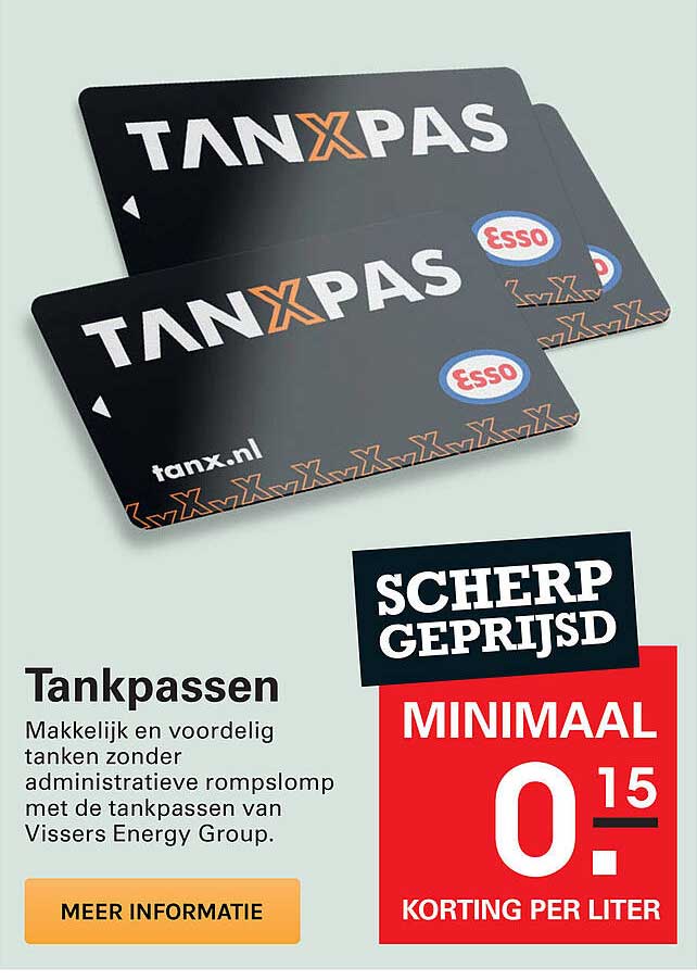 Ontdek de voordelen van de tankpassen van Vissers Energy Group! Met deze tankpassen wordt het tanken een stuk makkelijker en voordeliger. Geen gedoe meer met administratieve rompslomp, zodat jij je kunt focussen op waar het echt om gaat: moeiteloos rijden. Deze aanbieding is perfect voor zowel zakelijk als particulier gebruik.
