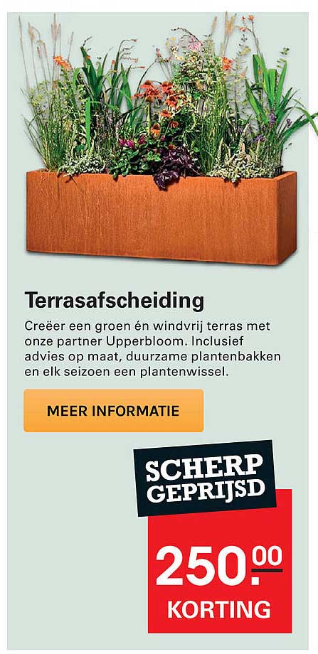 Ben jij op zoek naar een manier om jouw terras nog gezelliger en groener te maken? Dan hebben we goed nieuws voor je! Deze aanbieding voor een terrasafscheiding biedt de perfecte oplossing. Met de stijlvolle plantenbakken van onze partner Upperboom creëer je een groene oase die niet alleen mooi oogt, maar ook functioneel is. Of je nu van een volledige privacy wilt genieten of gewoon een beetje ruimte wilt afbakenen, met deze aanbieding ben je aan het juiste adres.