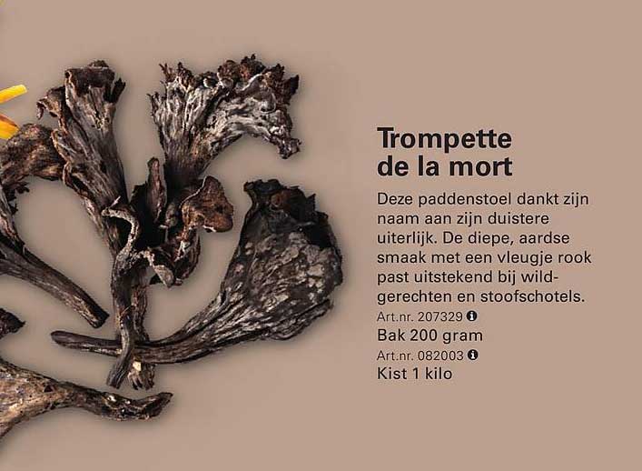 Bekijk nu de Trompette de la mort aanbieding in de Sligro folder. Deze aanbieding is geldig van 09-10-2025 tot en met 27-10-2025.