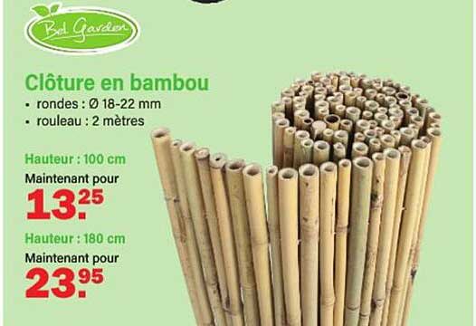 Ben je op zoek naar een stijlvolle, duurzame en milieuvriendelijke manier om je tuin af te schermen? Dan is de Clôture en bambou van Bel Garden een perfecte keuze! Deze prachtige bamboe schutting, die zowel functioneel als decoratief is, biedt niet alleen privacy, maar voegt ook een natuurlijke uitstraling aan je buitenruimte toe. Het is het ideale moment om te investeren in deze aanbieding, die geldig is van 15 augustus tot en met 6 september 2025.