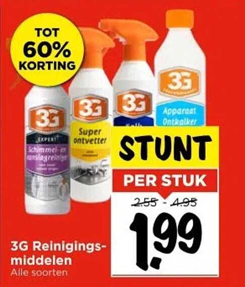Bekijk de 3G Reinigingsmiddelen aanbieding bij Vomar! Deze fantastische aanbieding is nu beschikbaar in de nieuwste Vomar folder. Profiteer van deze kans en bespaar flink op je aankoop.