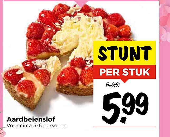 Ben je klaar om je smaakpapillen te verwennen? De aardbeienslof is dé perfecte traktatie voor elke gelegenheid. Met zijn romige vulling en een overvloed aan verse aardbeien, elke hap is een feestje voor je mond! Deze aanbieding is ideaal voor een verjaardag, een feest of gewoon als je jezelf wilt verwennen. Van 7 tot en met 10 mei kun je deze verrukkelijke slof voor een aantrekkelijke prijs bemachtigen.
