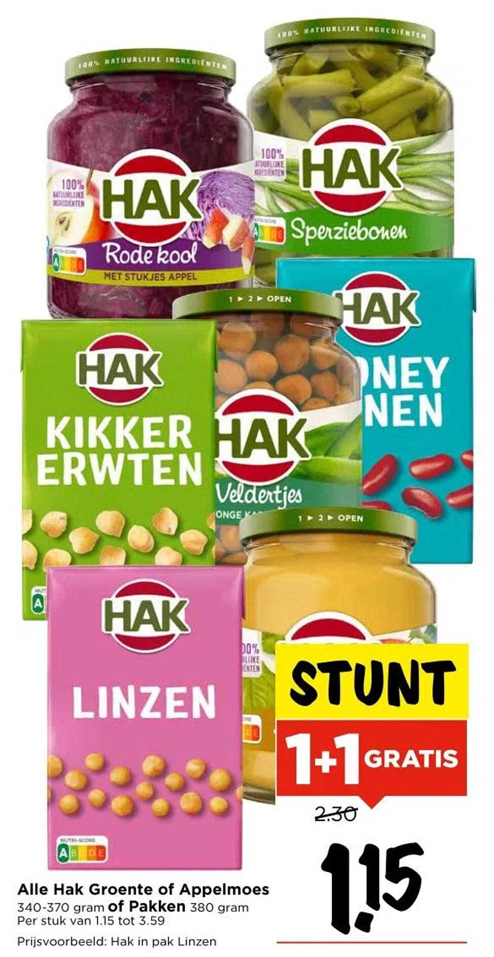 Hak staat bekend om zijn kwaliteitsproducten die gemaakt zijn van puur natuurlijke ingrediënten. Of je nu kiest voor groenten of appelmoes, je haalt een product in huis dat niet alleen lekker is, maar ook vooral voedzaam. Perfect voor een snelle maaltijd of als bijgerecht. Met de ‘1 + 1 gratis’ actie kun je ook nog eens extra besparen, wat deze aanbieding nog aantrekkelijker maakt.