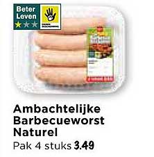 De ambachtelijke barbecueworst naturel is verpakt per 4 stuks, ideaal voor een gezellige avond met vrienden of familie. De worst heeft een rijke, volle smaak en is gemaakt van hoogwaardig vlees, met een perfect uitgebalanceerde mix van kruiden. Dit maakt ze niet alleen lekker voor op de barbecue, maar ook geschikt voor in de pan of oven. Met een Beter Leven keurmerk, kies je voor dierenwelzijn en duurzaamheid.