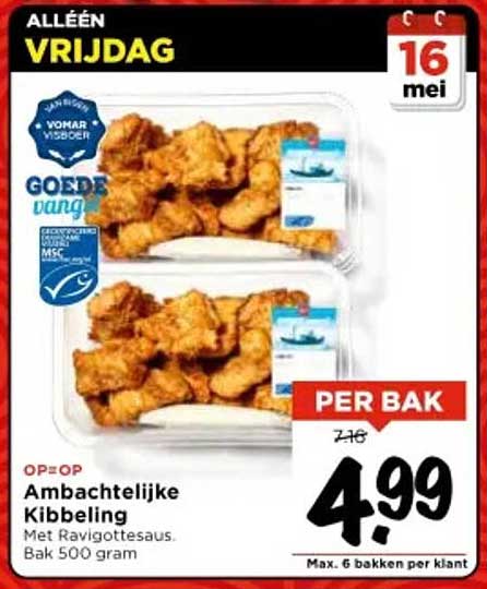 Bekijk nu de Ambachtelijke Kibbeling met Ravigottesaus aanbieding in de Vomar folder. Deze aanbieding is geldig van 14-05-2025 tot en met 17-05-2025.