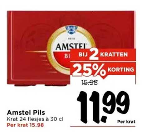 De normale prijs voor een krat Amstel Pils bedraagt €15,98. Met de huidige aanbieding van 25% korting, betaal je slechts €11,99 per krat bij aankoop van twee kratten. Dit betekent een aanzienlijke besparing en maakt het een uitstekende keuze voor de prijsbewuste bierliefhebber.