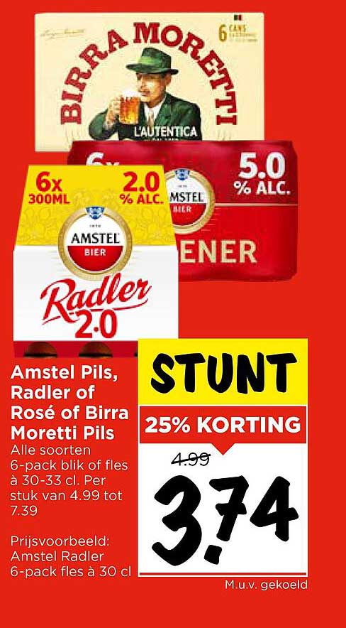 Bekijk nu de Amstel Pils, Radler of Rosé of Birra Moretti Pils aanbieding in de Vomar folder. Deze aanbieding is geldig van 23-07-2025 tot en met 26-07-2025.