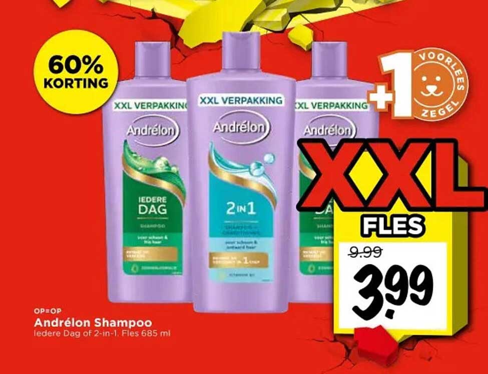 Verwen jezelf met de Andrélon Shampoo, beschikbaar in de krachtige formules 'Iedere Dag' en '2-in-1'. Deze aanbieding maakt het mogelijk om je haar op een heerlijke manier te verzorgen, zonder de bank te breken. Er is een flinke korting van 60% op de reguliere prijs, wat deze deal onweerstaanbaar maakt!