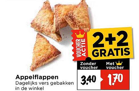 Bij Vomar profiteer je tijdelijk van een geweldige actie: wanneer je 2 appelflappen koopt, krijg je er 2 gratis! De reguliere prijs per appelflap is €3,40, maar met deze aanbieding betaal je slechts €1,70 per stuk. Dit maakt het een uitgelezen kans om te genieten van deze lekkernij zonder je portemonnee te veel te belasten.