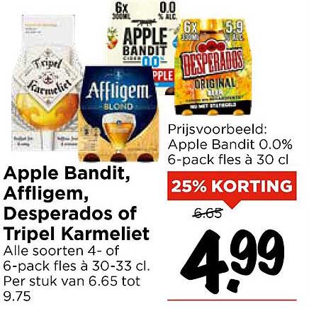 Bekijk nu de Apple Bandit, Affligem, Desperados of Tripel Karmeliet aanbieding in de Vomar folder. Deze aanbieding is geldig van 23-07-2025 tot en met 26-07-2025.