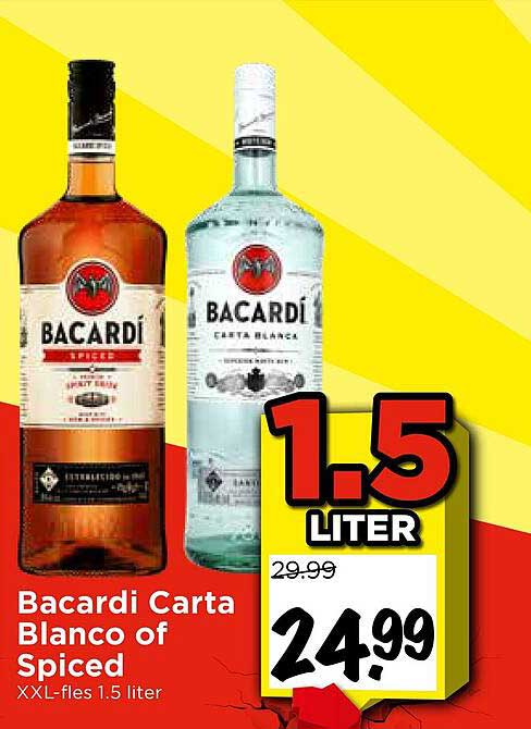Bekijk nu de Bacardi Carta Blanco of Spiced XXL-fles 1.5 liter aanbieding in de Vomar folder. Deze aanbieding is geldig van 09-07-2025 tot en met 12-07-2025.
