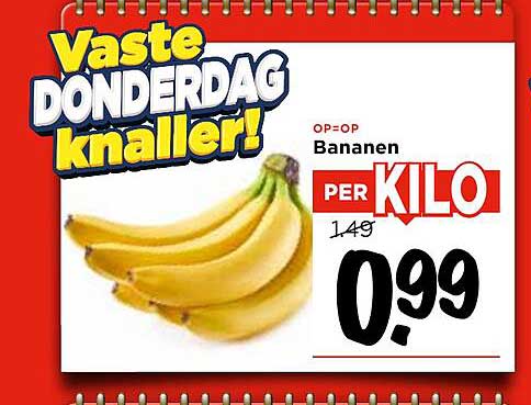 De normale prijs van bananen ligt rond de €1,49 per kilo. Maar nu maak je gebruik van een superdeal en betaal je slechts €0,99 per kilo! Dit betekent een besparing van maar liefst 50 cent! Een ideale gelegenheid om je voorraad aan te vullen.