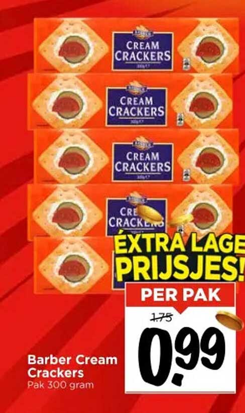 Ontdek de geweldige Barber Cream Crackers aanbieding in de nieuwste Vomar folder. Naast deze aanbieding vind je nog veel meer aantrekkelijke kortingen. Je kunt de Barber Cream Crackers eenvoudig online bestellen via de Vomar website of kopen in een winkel bij jou in de buurt.