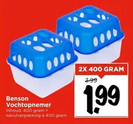 Ontdek de geweldige Benson Vochtopnemer aanbieding in de nieuwste Vomar folder. Naast deze aanbieding vind je nog veel meer aantrekkelijke kortingen. Je kunt de Benson Vochtopnemer eenvoudig online bestellen via de Vomar website of kopen in een winkel bij jou in de buurt.