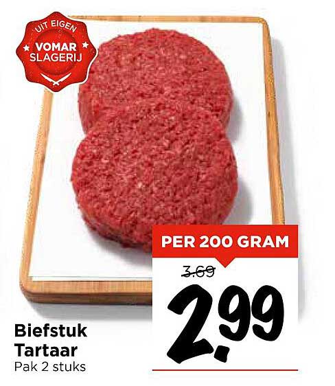 Bekijk nu de Biefstuk Tartaar Pak 2 stuks aanbieding in de Vomar folder. Deze aanbieding is geldig van 02-07-2025 tot en met 05-07-2025.
