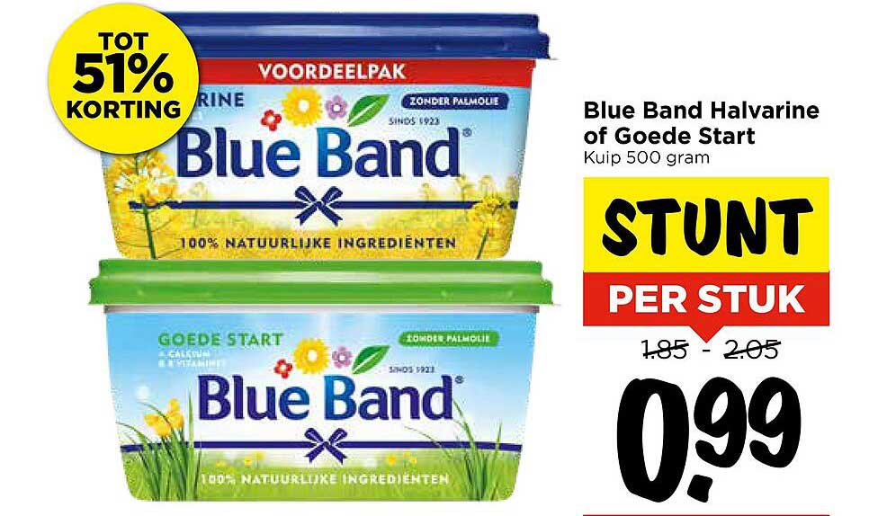 Als je op zoek bent naar een smakelijke en gezonde toevoeging aan je maaltijden, dan is deze aanbieding bij Vomar echt iets voor jou! De Blue Band Halvarine of Goede Start komt in een handige kuip van 500 gram en bevat 100% natuurlijke ingrediënten. Of je nu een broodje smeert, of het gebruikt in je favoriete recepten, met deze halvarine ben je verzekerd van een heerlijke smaak.