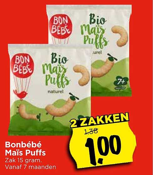 Bekijk nu de Bonbébé Maïs Puffs aanbieding in de Vomar folder. Deze aanbieding is geldig van 10-02-2025 tot en met 15-02-2025.