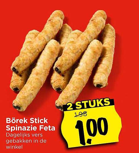 Ben je op zoek naar een lekkere snack die je snel kunt genieten? Dan is de Börek Stick Spinazie Feta een fantastische keuze! Deze heerlijke gefrituurde sticks zijn niet alleen een traktatie voor je smaakpapillen, maar ook een geweldige deal die je niet wilt mislopen. Van 23 juli 2025 tot 26 juli 2025 kun je ze voor een speciale prijs van slechts €1,00 per 2 stuks in de Vomar aanschaffen.