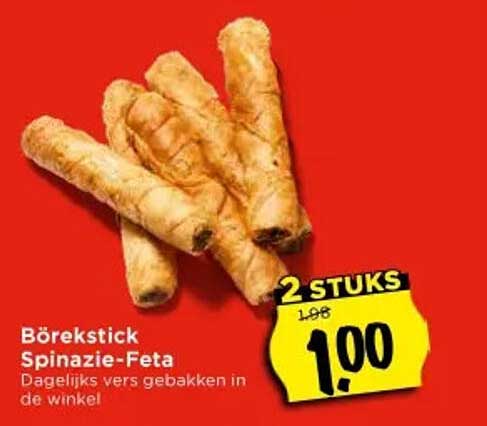 De Börekstick Spinazie-Feta is nu verkrijgbaar voor slechts €1,00 voor 2 stuks, in plaats van de reguliere prijs van €1,98. Dit betekent dat je nu niet alleen kunt genieten van een heerlijke snack, maar ook kunt besparen! Dit is de perfecte gelegenheid om je gasten te verrassen of om een aantal voor jezelf in te slaan!