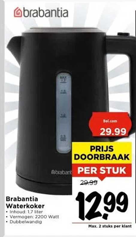 De Brabantia Waterkoker is nu verkrijgbaar voor slechts €12,99, terwijl de reguliere prijs €29,99 is. Dit betekent een spectaculaire korting die je niet kunt laten liggen! Met een besparing van maar liefst €17 kun je dit hoogwaardige product nu voor de halve prijs aanschaffen. Zeker weten dat je hiermee de beste keuze maakt voor je keuken.