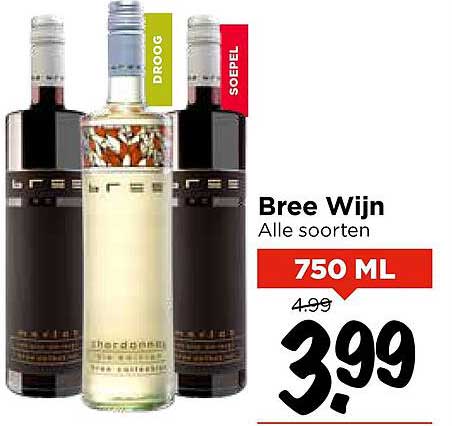 Bekijk nu de Bree Wijn Alle soorten 750 ML aanbieding in de Vomar folder. Deze aanbieding is geldig van 09-04-2025 tot en met 12-04-2025.