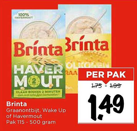Bekijk nu de Brinta Graanontbijt, Wake Up of Havermout Pak 115 - 500 gram aanbieding in de Vomar folder. Deze aanbieding is geldig van 30-10-2025 tot en met 01-11-2025.
