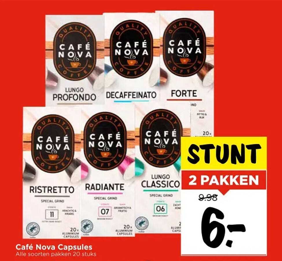 Ben je een echte koffieliefhebber? Dan moet je deze aanbieding zeker even bekijken! Bij Vomar vind je op deze pagina een geweldige deal voor Café Nova Capsules, die perfect zijn voor je dagelijkse kop koffie. Of je nu houdt van een sterke espresso of een milde lungo, deze capsules bieden een verscheidenheid aan smaken die je koffie-ervaring naar een hoger niveau tillen.