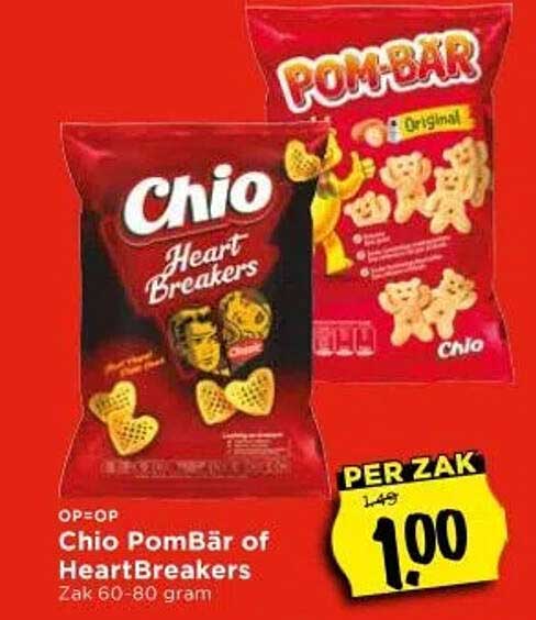 Bekijk nu de Chio PomBär of HeartBreakers Zak 60-80 gram aanbieding in de Vomar folder. Deze aanbieding is geldig van 25-09-2025 tot en met 27-09-2025.