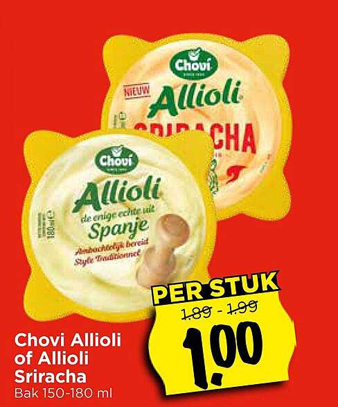 Ben je op zoek naar een smaakvolle toevoeging voor je gerechten? Dan is deze aanbieding van Chovi Allioli of Allioli Sriracha iets voor jou! Deze heerlijk romige sauzen zijn perfect om te combineren met allerlei gerechten, van sandwiches tot tapas. Met een aantrekkelijke prijs van slechts €1,00 per stuk, is dit de kans om deze authentieke smaakmakers in huis te halen.