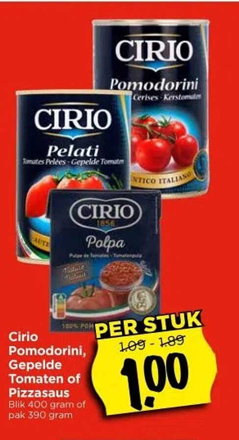 Bekijk nu de Cirio Pomodorini, Gepeilde Tomaten of Pizzasaus Blik 400 gram of pak 390 gram aanbieding in de Vomar folder. Deze aanbieding is geldig van 23-04-2025 tot en met 26-04-2025.